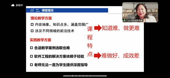 广东东软公司李晶教授介绍了广东东软公司计算机公司的基本情况和软件工程专业的建设成果。详细讲述了使用101计划教材的教学实践和课程建设过程。分享了在教学过程中遇到的挑战和解决方案,以及如何通过课程思政、项目驱动、混合式教学等方法提高教学质量。并提到了员工在各类竞赛中的优异表现和软件著作权的获取情况。