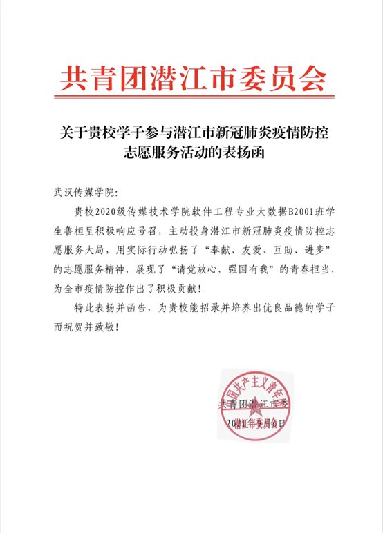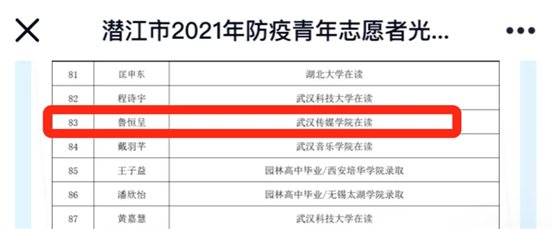 图为“青春潜江”微信公众号发布的《2021年防疫青年志愿者光荣榜》名单,鲁桓呈同学上榜。