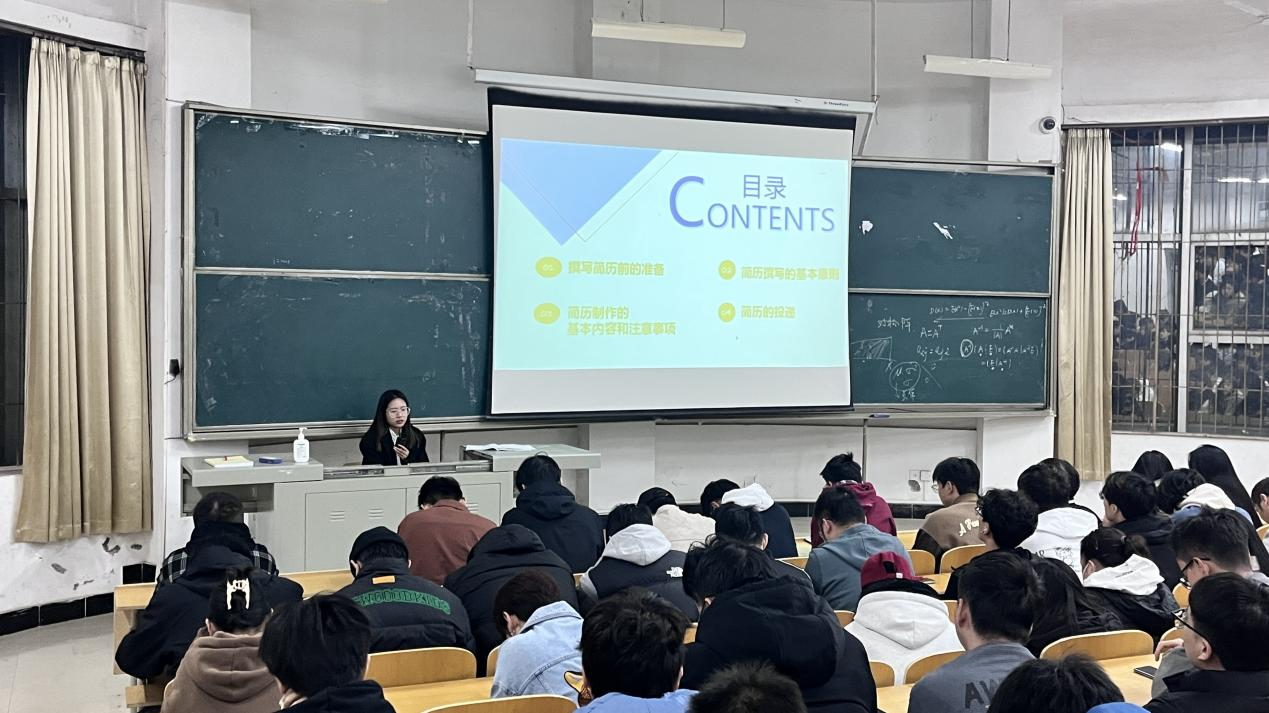 讲座上,朱老师就“撰写简历前的准备、简历撰写的基本原则、简历制作的基本内容和注意事项、简历的投递”四个大方面进行讲解,并从面试官的角度提醒同学们面试时的注意事项。