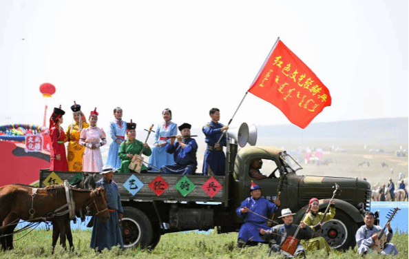 2024年7月14日,乌兰牧骑队员在内蒙古第34届草原那达慕开幕式上表演。