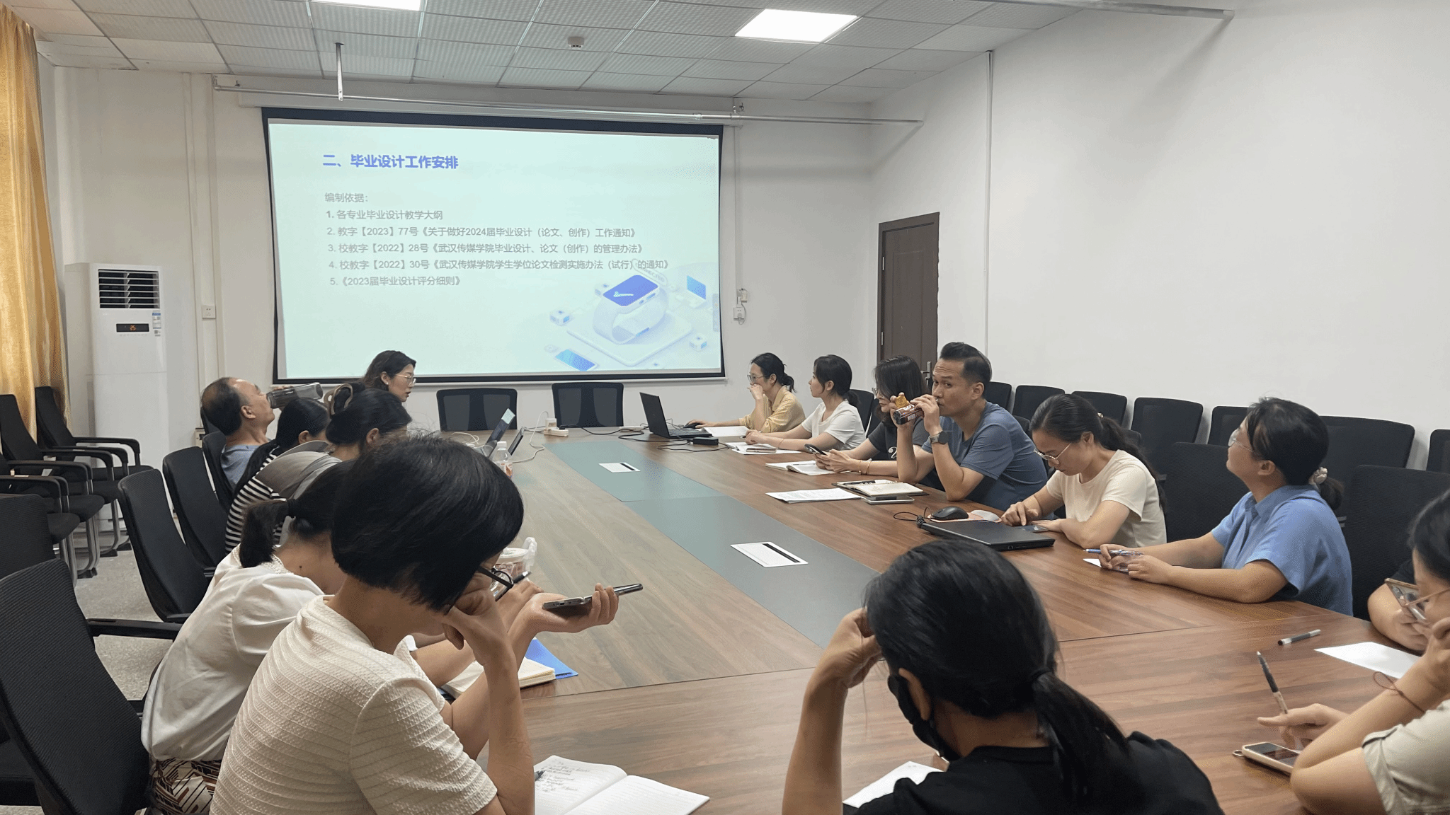 2.强调毕业设计的工作程序与规范:毕业设计工作时间跨度大,内容多,需要公司各专业统一部署协同工作,公司目前统一了毕业设计的整体进程和各环节的工作安排。胡经理特别强调了需要严格把控进度安排和归档资料的规范性问题,要求委员会的各位成员务必要协同指导老师一起严格遵守毕业设计工作安排中的时间节点,按时完成相应的工作并在知网平台提交指定的文档。同时,要提醒各位指导老师一定要告知毕业生遵守学术道德,所有的文档资料必须满足公司的毕业设计撰写规范。