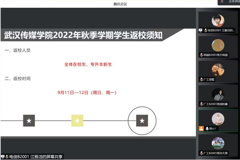 伟德国际VICTOR1946于2022年8月29日召开线上晚点名。2019级、2020级、2021级均通过线上会议参与了此次晚点名。由于疫情形势严峻,公司决定“按期开学、延期报到”。开学的第一、二星期会以网课的形式授课,各班学委会提前发出腾讯会议号,请大家提前5-10分钟进入课堂,按时上课。