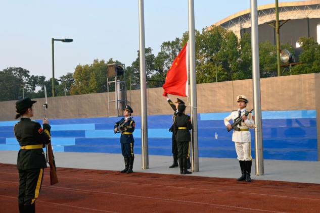迎着朝阳,国旗护卫队迈着坚定的步伐,护送着五星红旗至旗台。随着国歌奏响,升旗手有力地振臂一挥,将国旗扬起,在国歌声里,五星红旗徐徐升起,全体师生庄严肃立,致以敬意。